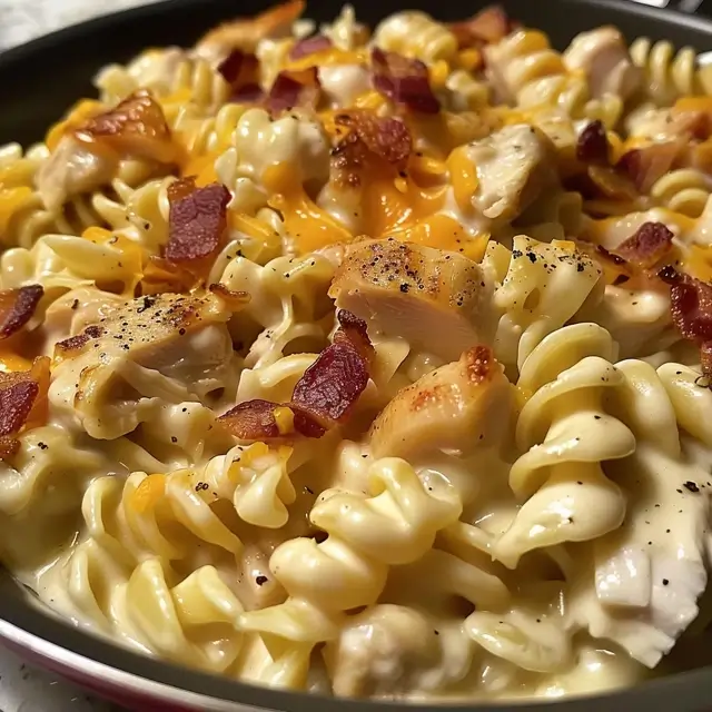 - Combine pasta and chicken with the sauce, garnish with bacon, and serve warm.