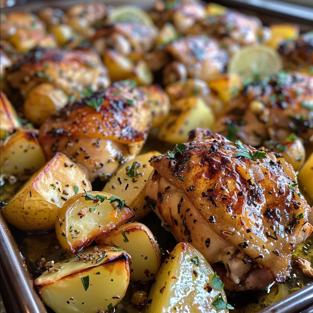 - Rub the chicken thighs with the remaining olive oil, garlic, rosemary, thyme, salt, and pepper. Place them on the baking sheet with the potatoes.