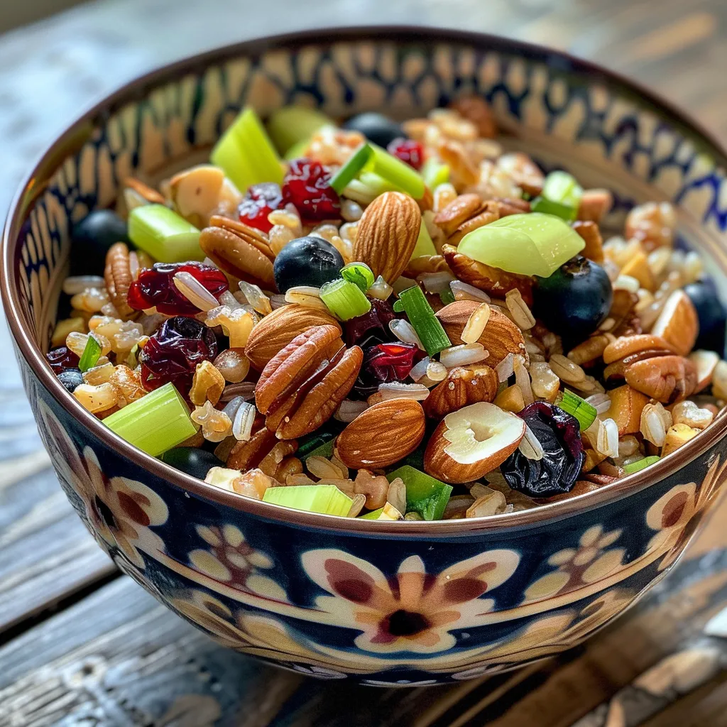 - Combine rice, dried fruits, nuts, and herbs in a bowl.