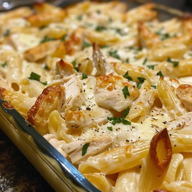 A rich and creamy baked pasta dish combining tender chicken, al dente penne, and a luscious Alfredo sauce topped with melted mozzarella. Perfect for a comforting family dinner.